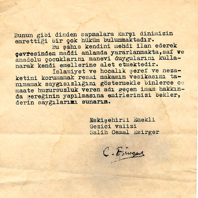 "Bunun gibi dinden sapmalara karşı dinimizin emrettiği birçok hüküm bulunmaktadır. Bu şahıs kendini mehdi ilan ederek çevresinden maddi anlamda yararlanmakta, saf ve Anadolu çocuklarını manevi duygularını kullanarak kendi emellerine alet etmektedir. İslamiyet ve hocalık şeref ve nezaketini korumamak resmi makamın vesikasını tanımamak saygısızlığını göstermekle binlerce cemaate huzursuzluk veren adı geçen imam hakkında gereğinin yapılmasına emirlerinizi bekler, derin saygılarımı sunarım."