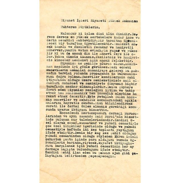 "Siyonizm ne şekilde olursa olsun, Müslüman nezdinde iyi gözle görülmez. Bazı ecnebi Musevilerin memaliki Osmaniye'ye gelerek bu maksadın tervici yolunda propagandada bulunmalarını doğru bulmam. Museviler kendilerinin dahi itirafında olduğu üzere memleketimizde nail oldukları muhabbet ve samimiyete dünyanın hiçbir tarafında mazhar olmamışlardır. Daima şüpheye davet eden Siyonizm mesleğini iltizam ve takip etmek hem Müslümanlık hem insanlık aleyhine hareket etmek demektir. Ekte Fetullah Gülen hocanın Museviler ve mehdilik konularındaki açıklamalarını hayretle okudum. Sizi bilgilendirmek sureti ile derhal önlem almanız gerektiği konusunda uyarma ihtiyacı hissetim."