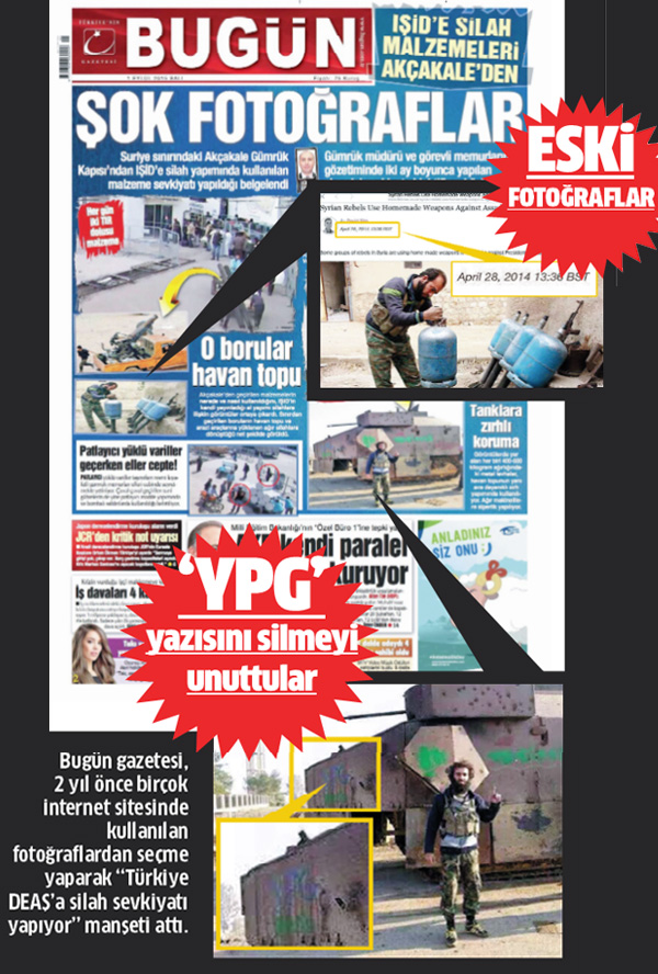 Akın İpek’in Gazetesi Bugün’ün Koza İpek Grubu’na yapılan operasyon öncesi dün manşetten ‘Türkiye DAEŞ’e silah sevkiyatı yapıyor’ haberiyle çıkması dikkatlerden kaçmadı. Haberde ‘örgüte yapılan silah sevkiyatı’nın fotoğraflarına da yer verildi. Ancak haberin yalan olduğu ve 2 yıl önceki fotoğraflarla yapıldığı kısa sürede anlaşıldı. Çünkü haberde DAEŞ’e verildiği ileri sürülen bir tanka ait fotoğrafın üzerindeki YPG yazısı dikkatlerden kaçmadı. YPG yazısını silmeyi unutan gazetenin bazı fotoğrafların ise 2 yıl önce çeşitli internet sitelerinden ve paralel medya kontrolündeki Cumhuriyet’ten alarak kullandığı anlaşıldı. Bu fotoğraflardan biri de 2014 yılına ait. Bir yıl önce yayınlanan haberde muhaliflerin “Eski Halep bölgesinde rejim güçlerinin karargah olarak kullandığı binalara, mutfak tüpünden yapılan ‘cehennem’ adını verdikleri el yapımı havanlarla saldırdığı” anlatılıyor. Ancak Bugün Gazetesi bunu da çarpıtarak söz konusu malzemelerin Türkiye tarafından DAEŞ’e verdiğini yazmaktan çekinmedi.