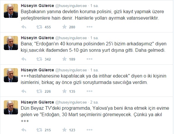 Bir zamanlar Paralel çete lideri Fetullah Gülen2e en yakın isimlerden biri olan Hüseyin Gülerce, dün Beyaz TV’de yaptığı açıklamalara bugün twetter’dan devam etti. Kendisine “Erdoğan 30 Mart seçimlerini göremeyecek, çünkü intihar edecek” denildiğini belirten Gülerce, aynı kişilerin “Erdoğan’ın 40 korumasından 25’i bizim arkadaşımız” dediğini söyledi.