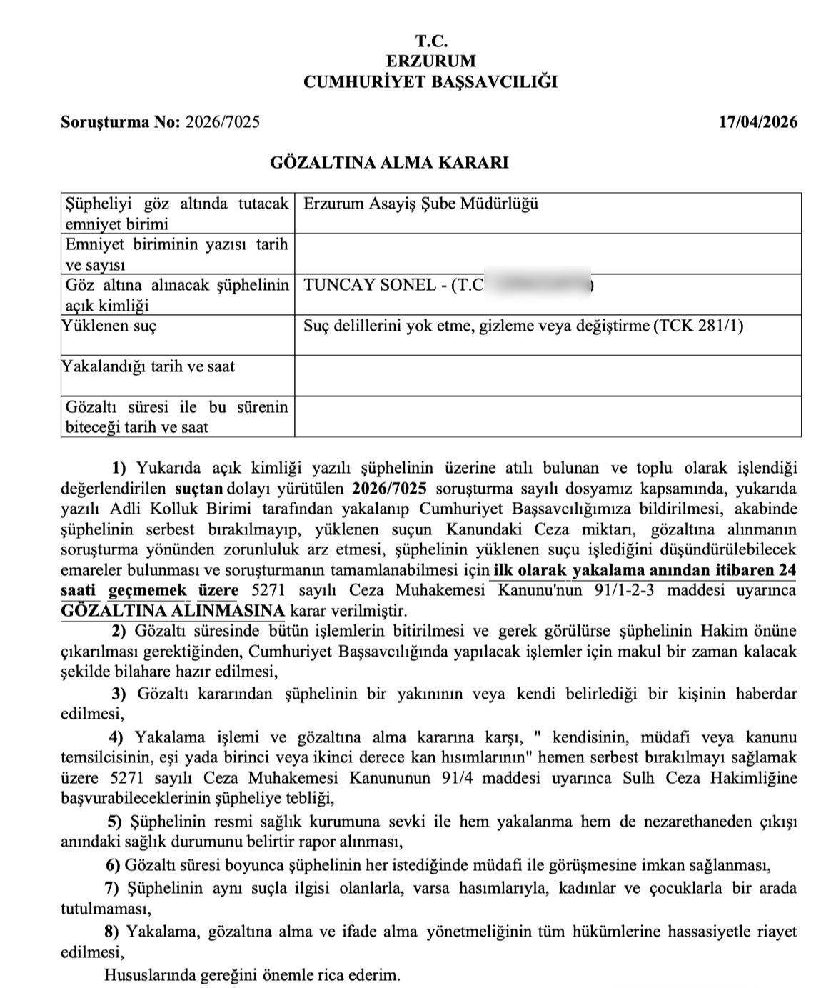 "Adı geçen şahsa atılı suçun 5237 sayılı Türk Ceza Kanununun 281/1 inci fıkrasında düzenlenen Suç delillerini yok etme, gizleme veya değiştirme suçu olduğu ve kişisel suç mahiyetinde bulunduğu, bu itibarla 5271 sayılı Ceza Muhakemesi Kanununun 161/6 ncı maddesinin emredici hükmü doğrultusunda Cumhuriyet Başsavcılığımız tarafından aynı Kanunun 160 ıncı maddesinin verdiği yetki ve sorumluluk uyarınca işin gerçeğini araştırmak için 2026/7025 işbu sıra sayısında soruşturma işlemlerine başlanıldığı,