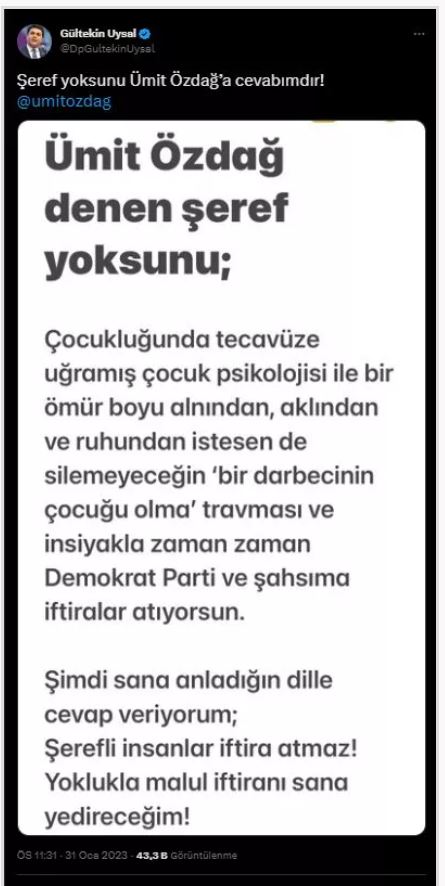 Özdağ'a sosyal medya hesabından yanıt veren Gültekin Uysal, "Demokrat Parti ve şahsıma iftiralar atıyorsun. Şimdi sana anladığın dille cevap veriyorum; Şerefli insanlar iftira atmaz! Yoklukla malul iftiranı sana yedireceğim!" ifadelerini kullandı. Uysal'ın, ''Çocukluğunda tecavüze uğramış çocuk psikolojisi'' ifadeleri ise sosyal medyada büyük tepki topladı. Tepkiler sonrası tweetini silen Uysal açıklama yapmadı.