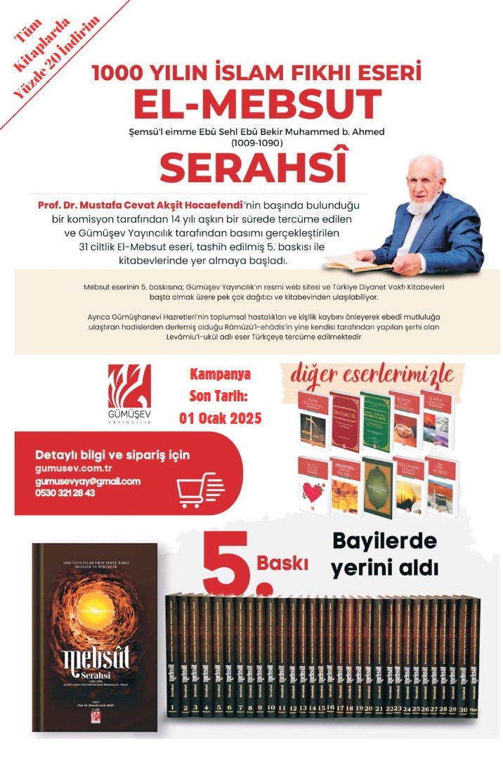 Gümüşev Yayıncılık, Mübarek 3 Aylar'da doğru bilgiye herkes ulaşabilsin diye tüm kitaplarda yüzde 20 indirim kampanyası başlattı. 1 Ocak 2025 tarihine kadar devam edecek kampanya, Prof. Dr. M. Cevat Akşit Hocaefendinin 31 Ciltlik El Mebsut, şu ana kadar 3 cildi basılan Levamiul Ukul, Dağarcık, Gümüşset paketinde yer alan İslam’da Lanetliler, İslam’da Ticaret Prensipleri, Haksız Rekabet, İslam Ceza Hukuku, Müslümanın 24 Saati, Mutlu Evlilik, Hac Rehberi kitapları başta olmak üzere Gümüşev Yayıncılık tarafından basımı yapılan Suç ve Suçlularla Mücadelede Nebevi Metodlar, Evrad-ı Şerif, Arapça ve İngilizce akademik kitaplar için de geçerli olacaktır. Sipariş vermek için 0530 321 28 43 numarası arayabilir veya www.gumusev.com.tr’yi ziyaret edebilirsiniz.