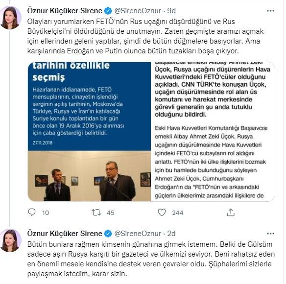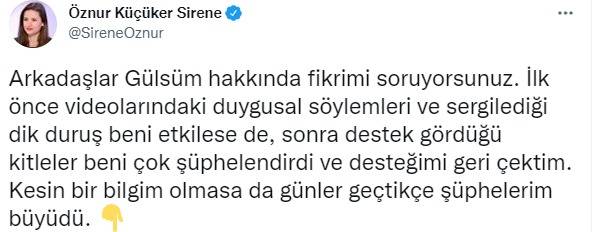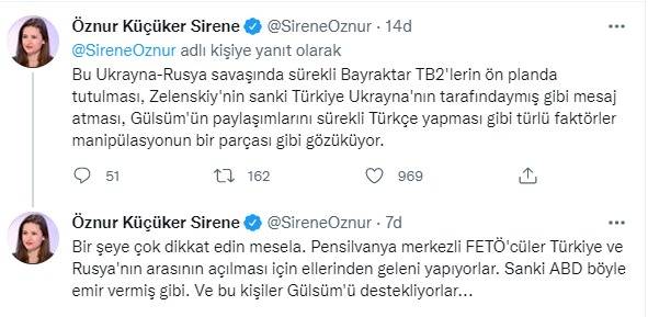 Uluslararası ilişkiler uzmanı Öznur Küçüker Sirene, Ukrayna’dan yaptığı yayınlarla dikkat çeken ve kısa sürede adından söz ettiren Gülsüm Khalilova’ya ilişkin dikkat çeken bir paylaşımda bulundu. Sirene yaptığı paylaşımda, “Arkadaşlar Gülsüm hakkında fikrimi soruyorsunuz. İlk önce videolarındaki duygusal söylemleri ve sergilediği dik duruş beni etkilese de, sonra destek gördüğü kitleler beni çok şüphelendirdi ve desteğimi geri çektim. Kesin bir bilgim olmasa da günler geçtikçe şüphelerim büyüdü. Bu Ukrayna-Rusya savaşında sürekli Bayraktar TB2'lerin ön planda tutulması, Zelenskiy'nin sanki Türkiye Ukrayna'nın tarafındaymış gibi mesaj atması, Gülsüm'ün paylaşımlarını sürekli Türkçe yapması gibi türlü faktörler manipülasyonun bir parçası gibi gözüküyor. Bir şeye çok dikkat edin mesela. Pensilvanya merkezli FETÖ'cüler Türkiye ve Rusya'nın arasının açılması için ellerinden geleni yapıyorlar. Sanki ABD böyle emir vermiş gibi. Ve bu kişiler Gülsüm'ü destekliyorlar. Olayları yorumlarken FETÖ'nün Rus uçağını düşürdüğünü ve Rus Büyükelçisi'ni öldürdüğünü de unutmayın. Zaten geçmişte aramızı açmak için ellerinden geleni yaptılar, şimdi de bütün düğmelere basıyorlar. Ama karşılarında Erdoğan ve Putin olunca bütün tuzakları boşa çıkıyor. Bütün bunlara rağmen kimsenin günahına girmek istemem. Belki de Gülsüm sadece aşırı Rusya karşıtı bir gazeteci ve ülkemizi seviyor. Beni rahatsız eden en önemli mesele kendisine destek veren çevreler oldu. Şüphelerimi sizlerle paylaşmak istedim, karar sizin” ifadelerini kullandı.