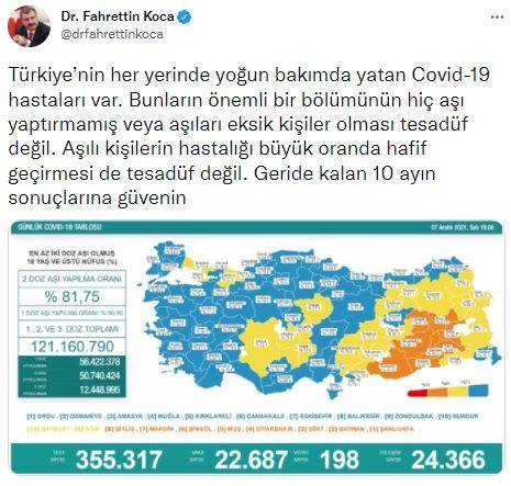 Sağlık Bakanı Fahrettin Koca, sosyal paylaşım sitesi Twitter hesabından yaptığı paylaşımda, “Türkiye’nin her yerinde yoğun bakımda yatan Covid-19 hastaları var. Bunların önemli bir bölümünün hiç aşı yaptırmamış veya aşıları eksik kişiler olması tesadüf değil. Aşılı kişilerin hastalığı büyük oranda hafif geçirmesi de tesadüf değil. Geride kalan 10 ayın sonuçlarına güvenin” dedi.
