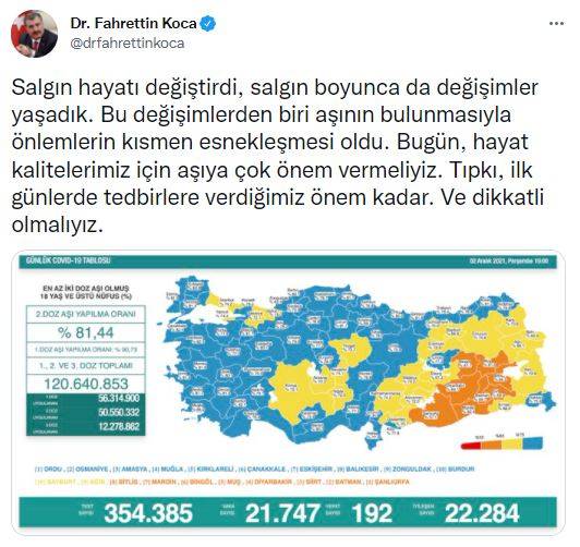 Sağlık Bakanı Fahrettin Koca, sosyal paylaşım sitesi Twitter hesabından yaptığı paylaşımda, “Salgın hayatı değiştirdi, salgın boyunca da değişimler yaşadık. Bu değişimlerden biri aşının bulunmasıyla önlemlerin kısmen esnekleşmesi oldu. Bugün, hayat kalitelerimiz için aşıya çok önem vermeliyiz. Tıpkı, ilk günlerde tedbirlere verdiğimiz önem kadar. Ve dikkatli olmalıyız” dedi.