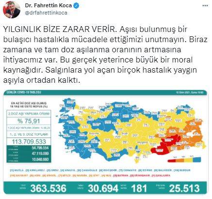 Sağlık Bakanı Fahrettin Koca, sosyal paylaşım sitesi Twitter hesabından yaptığı paylaşımda, “Yılgınlık bize zarar verir. Aşısı bulunmuş bir bulaşıcı hastalıkla mücadele ettiğimizi unutmayın. Biraz zamana ve tam doz aşılanma oranının artmasına ihtiyacımız var. Bu gerçek yeterince büyük bir moral kaynağıdır. Salgınlara yol açan birçok hastalık yaygın aşıyla ortadan kalktı” dedi.