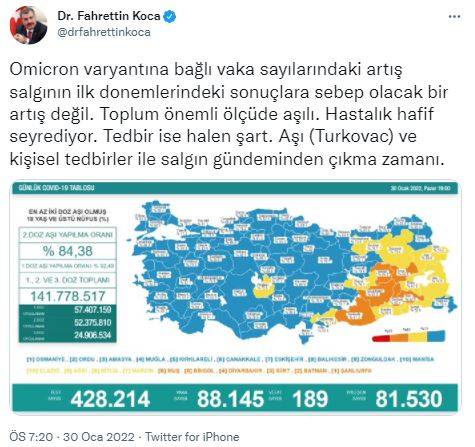 Sağlık Bakanı Fahrettin Koca, sosyal paylaşım sitesi Twitter hesabından yaptığı paylaşımda “Omicron varyantına bağlı vaka sayılarındaki artış salgının ilk dönemlerindeki sonuçlara sebep olacak bir artış değil. Toplum önemli ölçüde aşılı. Hastalık hafif seyrediyor. Tedbir ise halen şart. Turkovac aşı ve kişisel tedbirler ile salgın gündeminden çıkma zamanı” dedi.