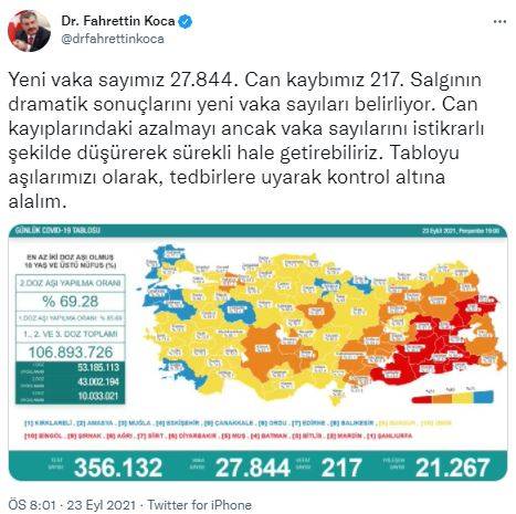 Sosyal medya hesabından günlük tabloyu paylaşan Sağlık Bakanı Fahrettin Koca, "Yeni vaka sayımız 27 bin 844. Can kaybımız 217. Salgının dramatik sonuçlarını yeni vaka sayıları belirliyor. Can kayıplarındaki azalmayı ancak vaka sayılarını istikrarlı şekilde düşürerek sürekli hale getirebiliriz. Tabloyu, aşılarımızı olarak, tedbirlere uyarak kontrol altına alalım." ifadelerini kullandı.