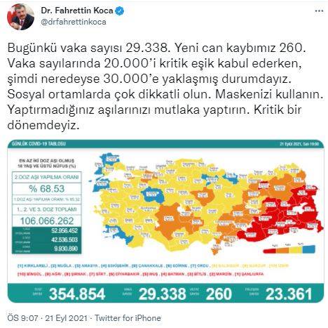 Sosyal medya hesabından günlük tabloyu ve bir haftalık vaka sayılarını paylaşan Sağlık Bakanı Fahrettin Koca, "Bugünkü vaka sayısı 29 bin 338. Yeni can kaybımız 260. Vaka sayılarında 20 bini kritik eşik kabul ederken, şimdi neredeyse 30 bine yaklaşmış durumdayız. Sosyal ortamlarda çok dikkatli olun. Maskenizi kullanın. Yaptırmadığınız aşılarınızı mutlaka yaptırın. Kritik bir dönemdeyiz." ifadelerini kullandı.