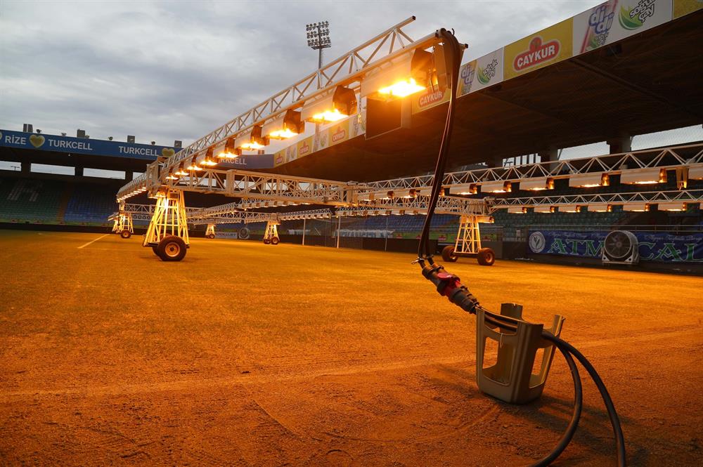 Türkiye'nin en fazla yağış alan ve güneşin en az görüldüğü ili olan Rize'de, ÇAYKUR Didi Stadyumu çimlerinin çürümemesi için çareyi yapay güneşte buldu.