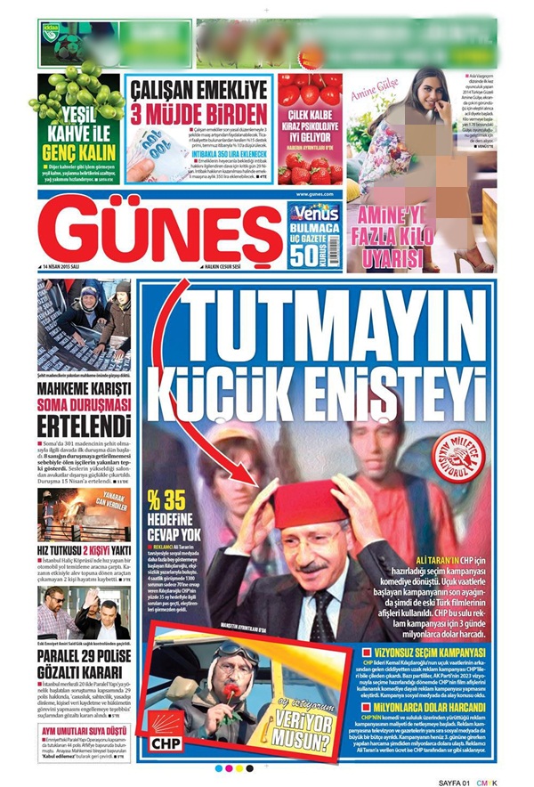 CHP'nin film afişli seçim kampanyasında 'Gülen Gözler' adlı Türk filminde, evlenmek istediği kızı sürekli istemesine rağmen, kızın babasının onayını bir türlü alamayan 'Vecihi' adlı karakterin de kullanılması dikkat çekmişti. Seçime dair her hamlesi mizah malzemesi olan CHP ile bu sefer de Güneş gazetesi dalga geçti. Gazete, bugün manşetine 'Tosun Paşa' adlı Türk filminde yer alan 'Tutmayın küçük enişteyi' repliğini taşıyarak CHP lideri Kılıçdaroğlu'nu 'küçük enişte' karakterine fotomontaj yaptı.