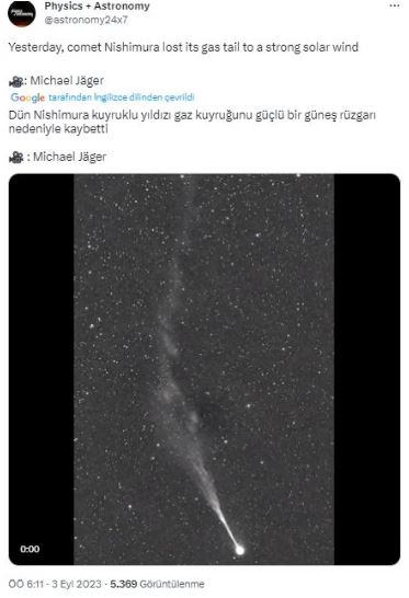 Nishimura Kuyruklu Yıldızı'nın, Güneş'ten yayılan yüklü parçacıklar nedeniyle kuyruğunu kaybettiği anlar ortaya çıktı.