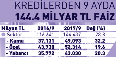 Bankacılık sektörü kârlılıkta rekora imza atarken, en çarpıcı gelişme, kredilerden alınan faiz gelirinde yaşandı. Başta Cumhurbaşkanı Recep Tayyip Erdoğan ve reel sektör olmak üzere faiz indirim çağrılarına karşı adeta 'sağıra' yatan bankacılık sektörünün, geçen yılın ilk 9 ayında 116.6 milyar TL olan kredilerden sağlanan faiz geliri, bu yılın aynı döneminde yüzde 23.8 artarak 144.4 milyar liraya çıktı.