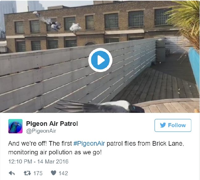 Birkaç güvercinden oluşan Piegon Air Patrol adlı devriyeyi oluşturan ekibin amacı, hava kirliliği konusunda İngiliz halkı arasında farkındalık yaratmak. Eğitimli güvercinlere giydirilen 25 gramlık sensörler havadaki azot dioksit ve ozon seviyesini ölçüyor. @PigeonAir Twitter hesabından ise kendi muhitlerindeki hava kirliliği seviyesini öğrenmek isteyen Ckullanıcılara istedikleri bilgi anlık olarak veriliyor.