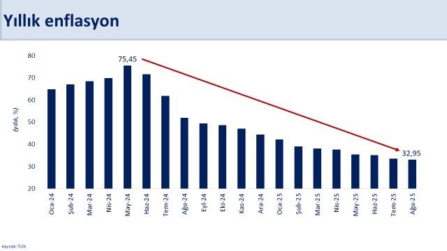 Hazine ve Maliye Bakanı Mehmet Şimşek, ağustos ayı enflasyon oranlarına ilişkin NSosyal hesabından açıklama yaptı. Bakan Şimşek, "Dezenflasyon süreci kesintisiz devam ediyor. Ağustosta yıllık enflasyon geçen yılın mayıs ayına göre 42,5 puan gerileyerek yüzde 33'ün altına indi. Zirai don ve kuraklığın da etkisiyle uzun dönem ortalamasının oldukça üzerinde fiyat artışı gerçekleşen gıda grubunun aylık enflasyona etkisi 0,7 puan oldu. Yıllık temel mal ve hizmet enflasyonundaki düşüş ağustosta da devam etti. Temel mal enflasyonu yüzde 19,8 gerçekleşirken, hizmet enflasyonu 2022 yılı Nisan ayından sonraki en düşük seviyesi olan yüzde 45,8'e geriledi. Sürdürülebilir büyüme ve toplumsal refah artışı için ön koşul olan fiyat istikrarını kalıcı şekilde sağlamak için mali disiplini ve yapısal adımlarımızı aynı kararlılıkla sürdüreceğiz" ifadelerini kullandı.