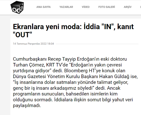 Cumhurbaşkanı Recep Tayyip Erdoğan'a diktatör suçlamasında bulunup, Türkiye'den İngiltere'ye kaçan ve Londra’da hastasını tedavi ettiremediği için Türkiye'ye getirip Erdoğan'ın kurduğu sağlık sistemi sayesinde tedavi ettirebilen Dr. Turhan Çömez, FETÖ kaynaklı yalanları ile iktidarı hedef aldı. Çömez'in ortaya attığı iddialara delil sunmamasına ODA TV bile, "Ekranlara yeni moda: İddia 'IN', kanıt 'OUT' " ifadeleri ile tepki gösterdi.