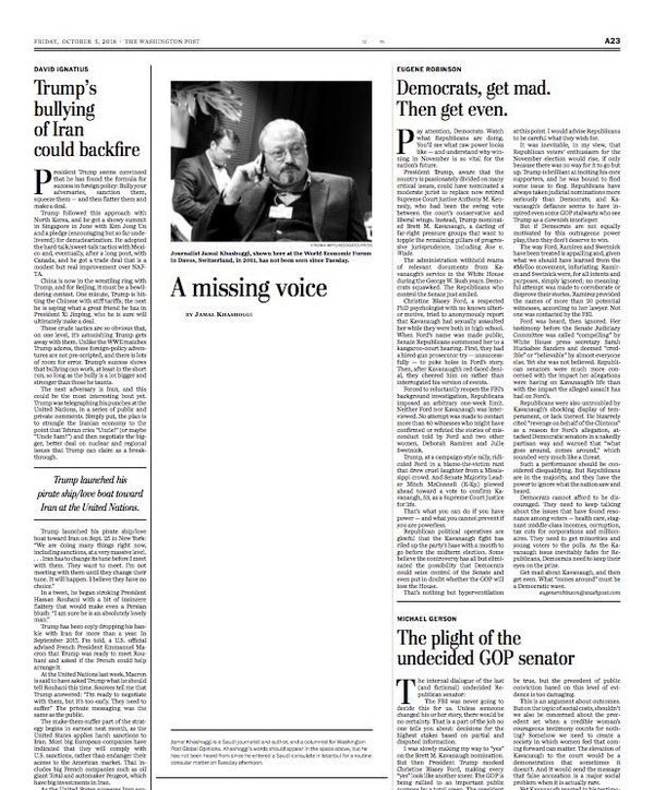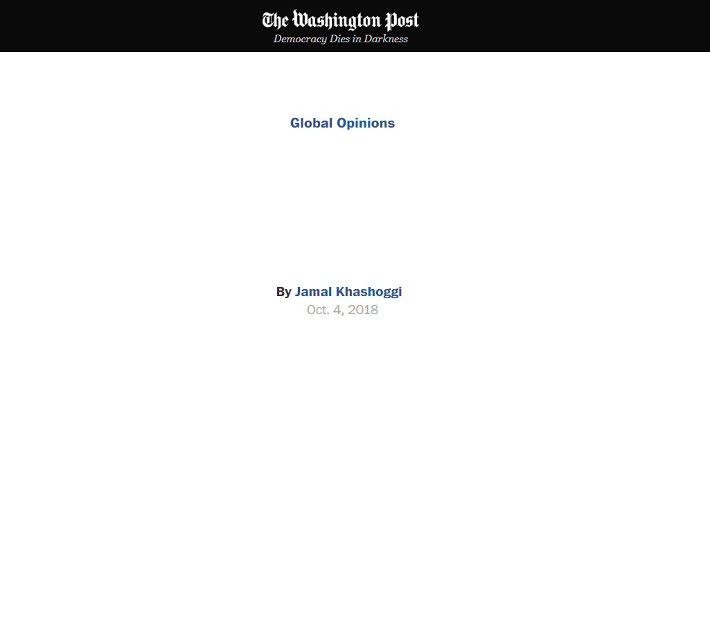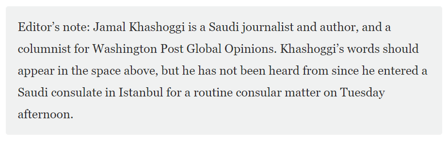 “Cemal Kaşıkçı bir Suudi gazeteci ve yazar. Aynı zamanda Washington Post Küresel Fikirler için yazan bir köşe yazarı. Kaşıkçı'nın sözleri yukarıdaki boşlukta yer almalıydı, ancak Salı öğleden sonra rutin bir konsolosluk işlemi için İstanbul'daki Suudi konsolosluğuna girdikten sonra kendisinden haber alınamadı.”
