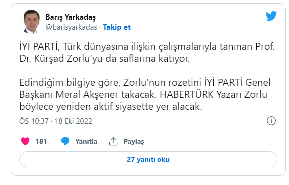 CHP'li eski milletvekili Barış Yarkadaş, Habertürk yazarı Prof. Dr. Kürşad Zorlu’nun İYİ Parti'ye katılacağını duyurdu.