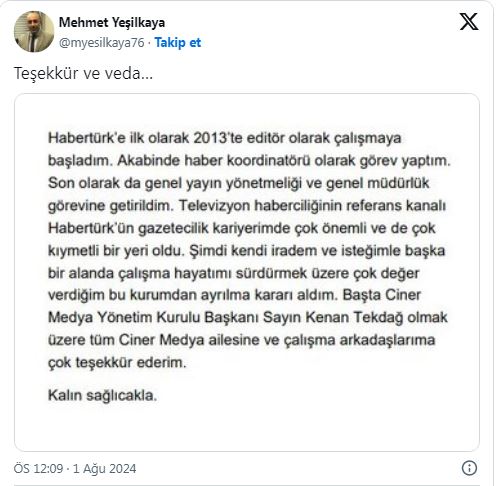 "Habertürk’te daha önce editör ve haber koordinatörü olarak görev yapan, son olarak da HABERTÜRK TV’nin genel yayın yönetmenliğini üstlenen değerli çalışma arkadaşımız Mehmet Yeşilkaya, kariyerini farklı bir alanda sürdürme kararı almıştır.