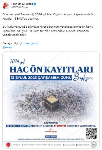 Diyanet İşleri Başkanı Erbaş, sosyal medyadan yaptığı açıklamada, Başkanlığın 2024 yılı Hac Organizasyonu kapsamında ön kayıtların 13 Eylül'de başlayacağını kaydetti.
