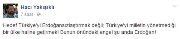 Hacı Yakışıklı, sosyal paylaşım sitesi üzerinden yaptığı açıklamada, "Hedef Türkiye'yi Erdoğansızlaştırmak değil; Türkiye'yi milletin yönetmediği bir ülke haline getirmek! Bunun önündeki engel şu anda Erdoğan!" ifadelerini kullandı.