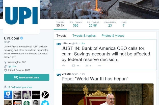 Amerika'da önde gelen gazetelerinden New York Post’la haber ajansı United Press International’ın Twitter hesabını ele geçiren hackerler, üçüncü dünya savaşının başladığını dair paylaşımlar yaparak kısa süreli paniğe neden oldu.