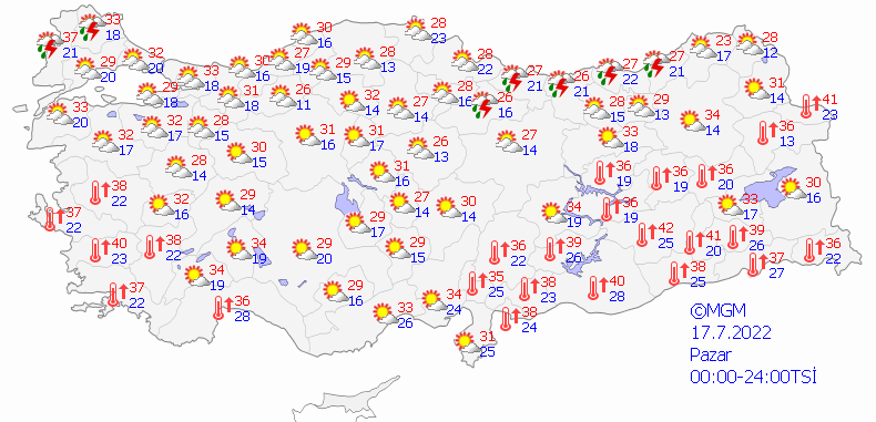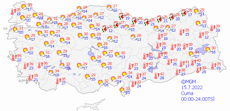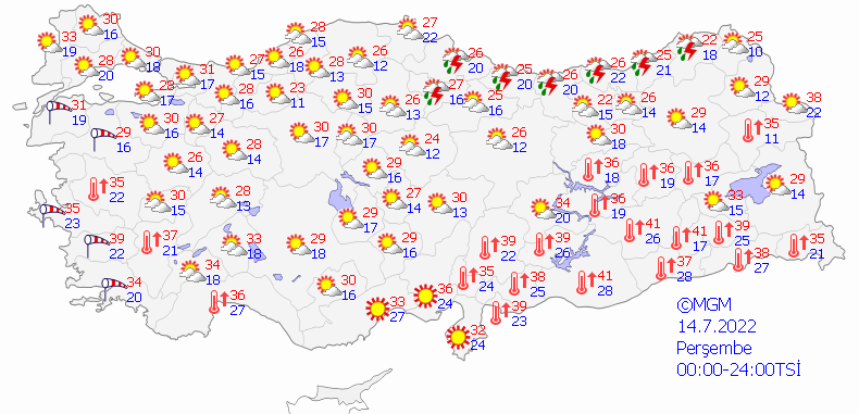 Meteoroloji Genel Müdürlüğü tarafından yapılan son değerlendirmelere göre: Yurdun kuzey kesimlerinin parçalı bulutlu; Orta ve Doğu Karadeniz kıyıları, Kastamonu, Karabük, Bolu, Sinop, Bilecik, Amasya, Tokat ve Çankırı çevreleri ile Ankara'nın kuzey çevreleri ve Bursa'nın doğusunun yerel olmak üzere sağanak ve gök gürültülü sağanak yağışlı, diğer yerlerin az bulutlu ve açık geçeceği tahmin ediliyor.