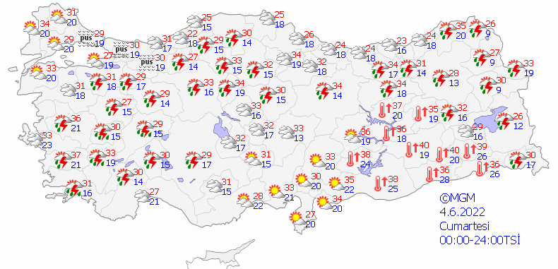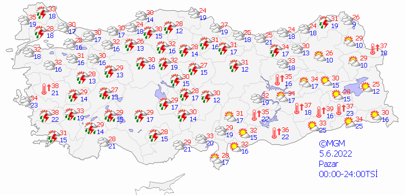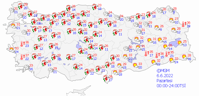 Meteoroloji Genel Müdürlüğü tarafından yapılan son değerlendirmelere göre: Ülkemiz genelinin parçalı, yer yer çok bulutlu, İç Ege, Batı Akdeniz'in iç kesimleri, İç Anadolu’nun kuzey ve batısı, Batı ve Doğu Karadeniz'in iç kesimleri, Doğu Anadolu’nun kuzey ve doğusu ile Aydın, İzmir ve Muğla’nın iç kesimleri, Amasya, Ordu ve Çorum çevrelerinin yerel olmak üzere sağanak ve gök gürültülü sağanak yağışlı geçeceği tahmin ediliyor. Yağışların yarın öğle saatlerinden sonra Aydın ve Muğla'nın iç kesimleri, Denizli, uşak ve Afyon çevrelerinde yerel olarak kuvvetli olması bekleniyor. Doğu Anadolu'nun batısı ve Güneydoğu Anadolu Bölgesi ile bu akşam ve gece saatlerinde İç Anadolu ile Batı Karadeniz'de toz taşınımı görülmesi bekleniyor. Bu gece ve sabah saatlerinde Marmara’nın doğusu ve Batı Karadeniz kıyılarında yer yer pus ve sis bekleniyor.