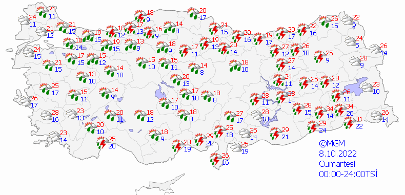 Meteoroloji Genel Müdürlüğü tarafından yapılan son değerlendirmelere göre: Ülkemiz genelinin parçalı yer yer çok bulutlu, Marmara’nın doğusu, İç Ege Akdeniz, İç Anadolu, Batı ve Orta Karadeniz, Doğu Karadeniz'in batısı, Doğu Anadolu'nun batısı ile Şanlıurfa, Diyarbakır, Batman, Siirt, Mardin, Bitlis ve Muş çevrelerinin sağanak ve yer yer gök gürültülü sağanak yağışlı geçeceği tahmin ediliyor. Yağışların Kastamonu, Kocaeli, Bilecik çevreleri ile Bursa’nın doğusunda Sakarya, Bolu, Düzce, Bartın, Zonguldak ve Kastamonu, Kocaeli, Bilecik çevreleri ile Bursa’nın doğusunda kuvvetli (21-50 kg/m2); Sakarya, Bolu, Düzce, Bartın, Zonguldak ve Karabük çevrelerinde yerel olarak çok kuvvetli ve şiddetli, Sivas ve Tokat çevreleri ile zamanla Ordu’nun iç ve batı kesimlerinde, bu akşam saatlerinde Konya, Osmaniye çevreleri, Ankara'nın güneyi, Karaman'ın kuzeyi , Adana'nın kuzeyi ve Aksaray'ın batısında kuvvetli olması bekleniyor.