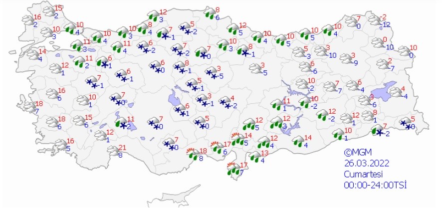 Meteoroloji Genel Müdürlüğü tarafından yapılan son değerlendirmelere göre: Ülkemiz genelinin parçalı ve çok bulutlu, Marmara’nın kuzey ve doğusu, Doğu Akdeniz, (Sivas hariç) İç Anadolu, Batı ve Orta Karadeniz, Doğu Karadeniz kıyıları, Doğu Anadolu’nun güneydoğusu, Güneydoğu Anadolu’nun batısı ile Afyonkarahisar, Kütahya, Isparta, Malatya, Erzurum, Ağrı, Iğdır ve Siirt çevrelerinin yağışlı geçeceği tahmin ediliyor. Marmara’nın kuzeyi, Doğu Akdeniz, Karadeniz kıyıları ile Güneydoğu Anadolu’nun batısında yağmur ve sağanak, yağış alan diğer yerlerde karla karışık yağmur ve kar şeklinde olması beklenen yağışların, Osmaniye, Kahramanmaraş, Gaziantep ve Adıyaman çevreleri ile Adana ve Hatay’ın kıyı kesimlerinde yerel kuvvetli olması bekleniyor. Karadeniz'in iç ve yüksek kesimleri ile Doğu Anadolu'da yüksek kar örtüsüne sahip eğimli bölgelerde çığ riski bulunmaktadır. Kuzey, iç ve doğu kesimlerde buzlanma ve don olayı bekleniyor.