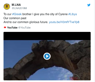 Hafter tarafından resmi M.LNA hesabından yayınlanan videoda, gelecekte Yunanlılar ile Libyalıları birleştirecek olan geçmiş ortak bağlara atıfta bulunarak,