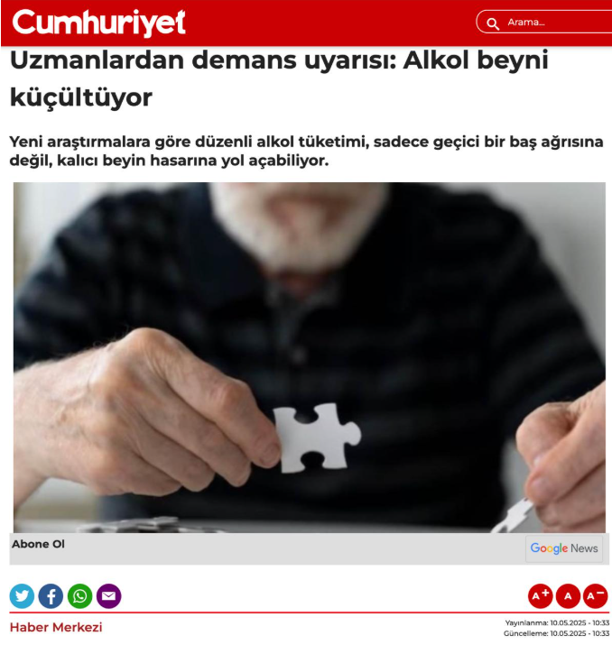 "Uzmanlardan demans uyarısı: Alkol beyni küçültüyor" başlıklı haberde "Düzenli alkol tüketimi, sadece geçici bir baş ağrısına değil, kalıcı beyin hasarına yol açabiliyor." ifadeleri kullanıldı.
