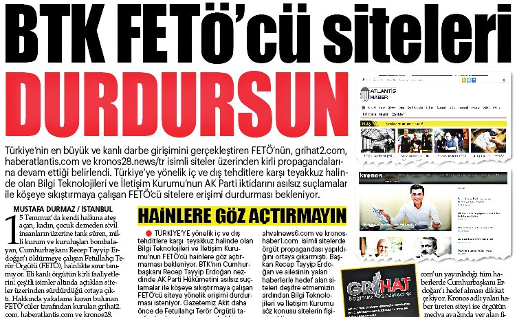 Gazetemiz Akit, “BTK FETÖ’cü siteleri durdursun” başlıklı haberinde, 15 Temmuz darbe girişimini “kurgu” olarak niteleyen grihat2.com’un yayınladığı tüm haberlerde Cumhurbaşkanı Erdoğan’ı hedef aldığını belirtmişti. Örgütün medya ayağında yer alan firari Doğan Ertuğrul’un Kronos adlı yalan haber üreten site üzerinden Türkiye aleyhine yayınlar yaptığı ifade edilmişti. 15 Temmuz darbe girişiminden sonra kurulan Atlantis Haber’in ise örgüt bülteni gibi çalıştığı ortaya çıkarılmıştı.