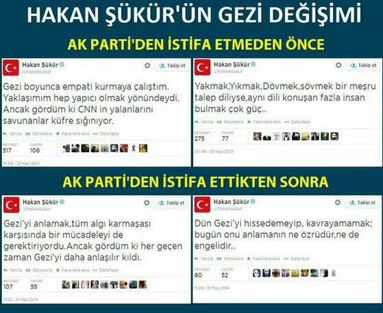 Sosyal medyada paylaşılan paralel yapının Meclis'teki temsilcisi Hakan Şükür'ün AK Parti'den istifa etmeden önce ve sonrası Gezi tweet'leri derlemesi büyük ilgi topladı.