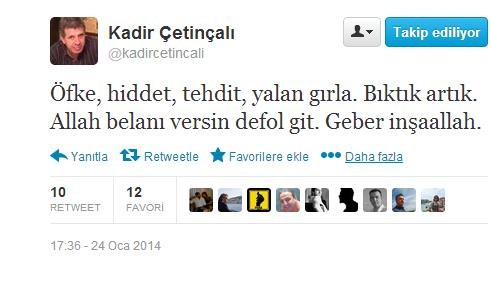 "Gazetemize zaman zaman spor yazıları yazan Kadir Çetinçalı, dün kişisel Twitter hesabından isim vermeden Başbakan Recep Tayyip Erdoğan'ı hedef aldığı düşünülen, hakaret içeren bir tweet attı. Daha sonra aldığı tepkiler nedeniyle bu tweet'i sildi, hedefinin Başbakan olmadığını ileri sürdü. Ancak kimi hedef alırsa alsın, hiçbir ahlaki değerle bağdaşmayan bu davranışı nedeniyle şu andan itibaren gazetemizle ilişkisi kesilmiştir. Okuyucularımıza duyurulur... (Ülke Haber)
