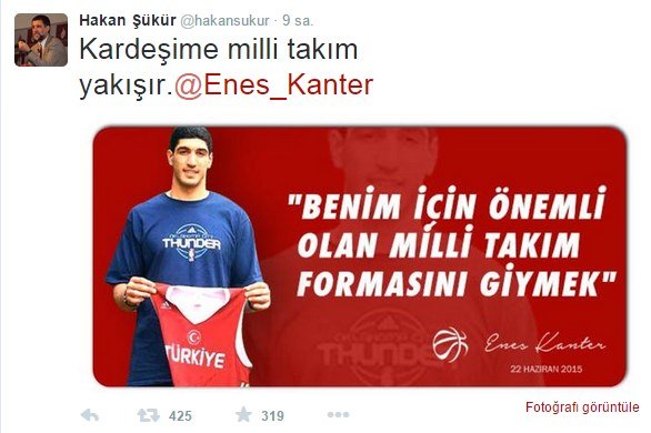 Sosyal medyadan yaptığı paylaşımlarla Türkiye'nin sıcak günemini yakından takip eden Hakan Şükür, 12 Dev Adam'ın kadrosu açıklanmadan önce dün gece "Enes Kanter'e milli takım yakışır." şeklinde attığı tweetle NBA'de Oklohama City Tunder'da forma giyen oyuncuya destek verdi. Ancak Ergin Ataman, bugün açıkladığı aday kadroda Enes Kanter'e yer vermedi.