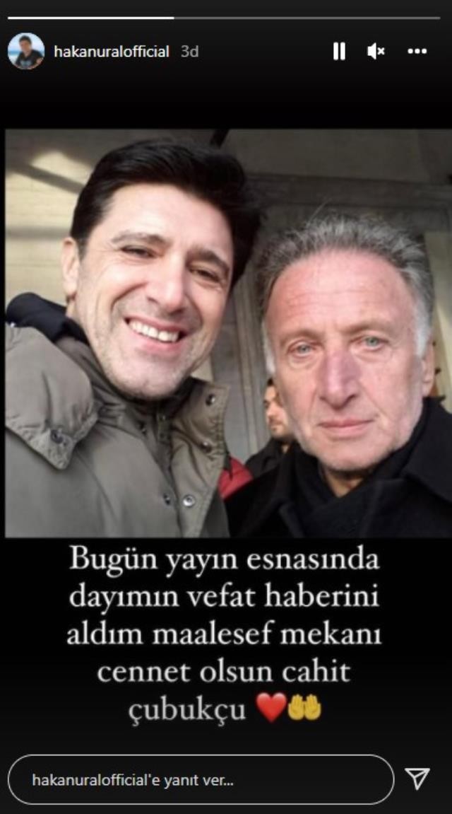 Oyuncu ve yorumcu Hakan Ural, bugünkü canlı yayınında dayısı Cahit Çubukçu'nun ölüm haberini aldı. Aldığı haber karşısında yıkılan Ural, sosyal medya hesabından acısını paylaştı.