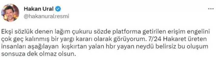 Hakan Ural Twitter hesabı üzerinden “Ekşi Sözlük denen lağım çukuru sözde platforma getirilen erişim engelini çok geç kalınmış bir yargı kararı olarak görüyorum. 7/24 Hakaret üreten insanları aşağılayan kışkırtan yalan haber yayan ne idüğü belirsiz bu oluşum sonsuza dek olmaz olsun.” dedi.
