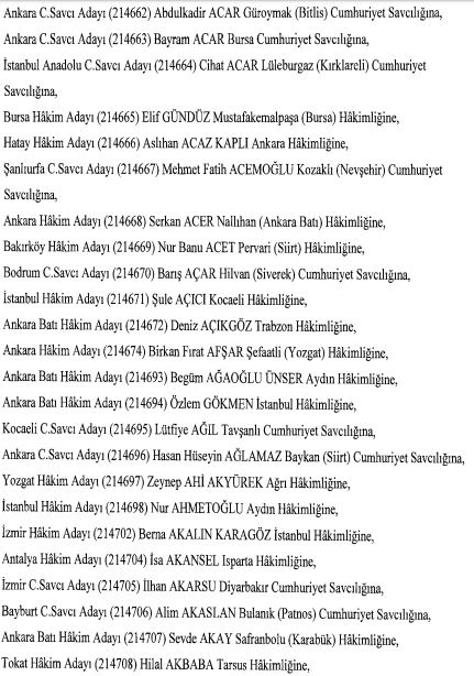 Adana Cumhuriyet Savcı adayı Kadir Çulha Giresun Cumhuriyet Savcılığına, Bayburt Cumhuriyet Savcı adayı Rıdvan Danayiyen Bakırköy Cumhuriyet Savcılığına, Kayseri hakim adayı Emin Ekmen Şuhut Hakimliğine, Antalya hakim adayı Soner Kantav İzmir Hakimliğine, Eskişehir Cumhuriyet Savcı adayı İrfan Karaman Sarıkamış Cumhuriyet Savcılığına, Erzurum Cumhuriyet Savcı adayı Mehmet Orçun Kıvrak Akdağmaden Cumhuriyet Savcılığına atandı.