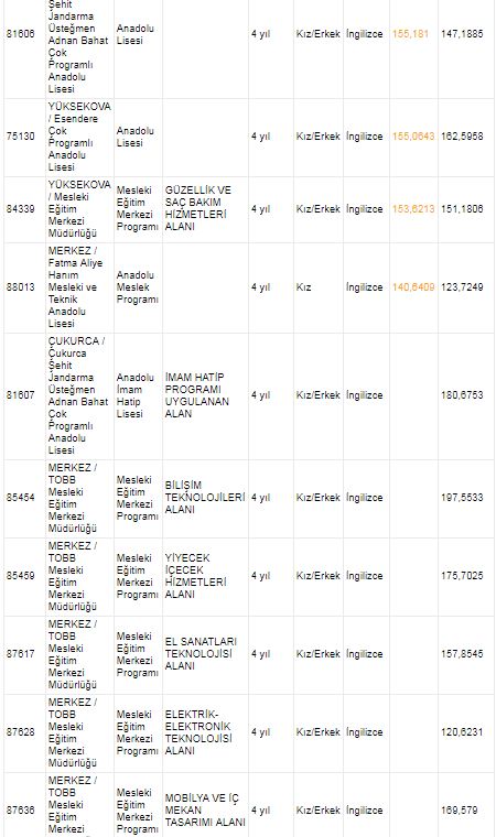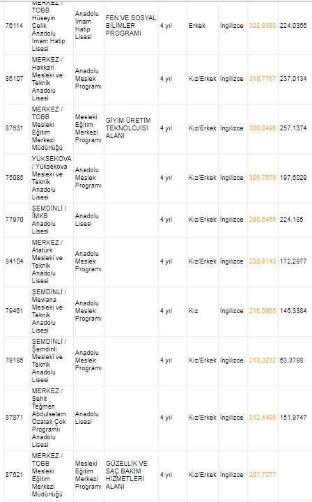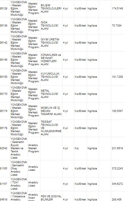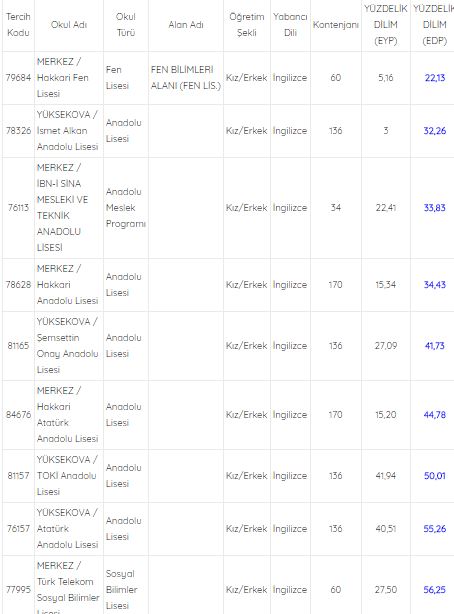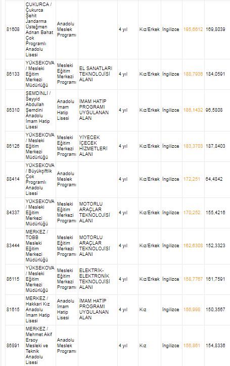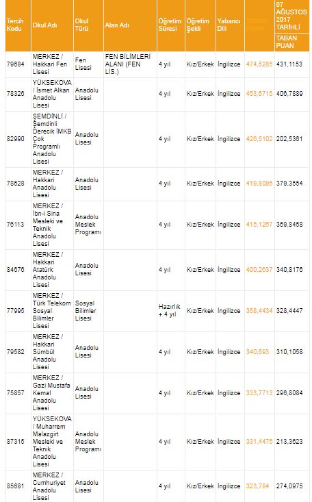 Hakkari lise taban puanları 2018 2019 MEB o okul Hakkari lise yüzdelik dilimleri