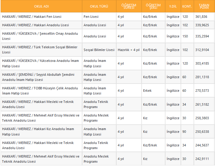 Hakkari liseleri taban puanı 2021, Hakkari liseleri başarı sıralaması ve liseleri kontenjanları nelerdir?