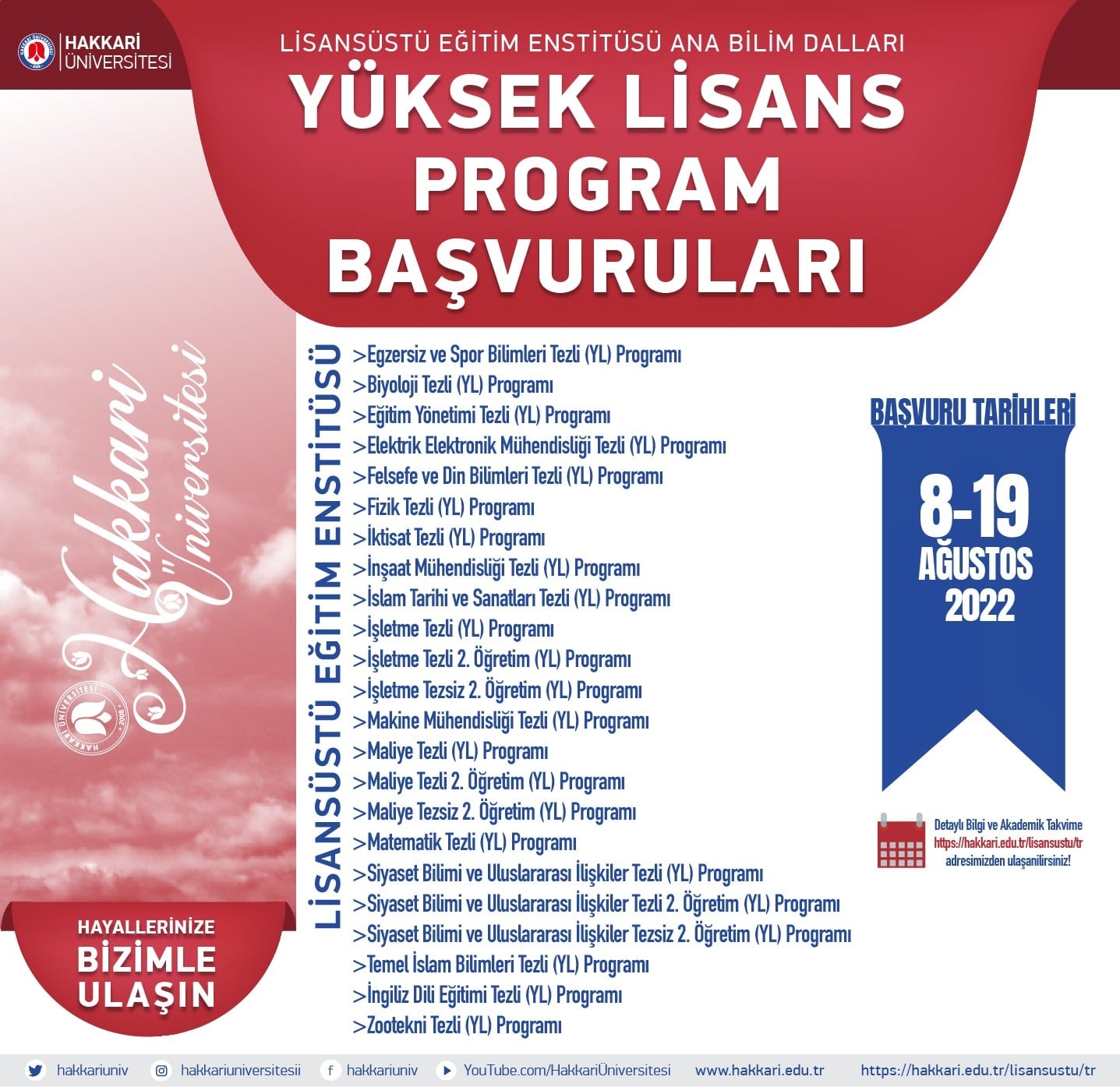 Tezsiz yüksek lisans alanında ise İşletme (Tezsiz Yüksek Lisans İkinci Öğretim Programı), Maliye ( Tezsiz Yüksek Lisan ) ve Siyaset Bilimi ve Uluslararası İlişkiler (Tezsiz Yüksek Lisans İkinci Öğretim Programı) olmak üzere 23 Anabilim Dalı’nda yapılacak alımlar için adaylar http://lisansustu.hakkari.edu.tr adresi üzerinden çevrim içi (Online) başvuru yapabilecekler.