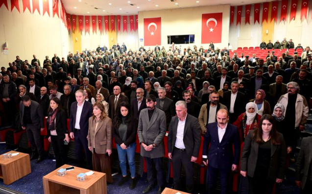 Necip Fazıl Kısakürek Kültür Merkezi’ndeki program İstiklal Marşı ile başladı. Herkes ayağa kalktı. Onlarca DEM Partili hep bir ağızdan marşımızı okudu.