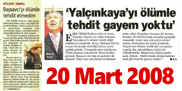 Ancak bu sözleri sarf eden Bülent Arınç kendisinin geçmişte yaptığı açıklamaları unuttu. 20 Mart 2008 tarihinde Yargıtay Başsavcısı Abdurrahman Yalçınkaya'yı ölümle tehdit ettiği iddialarına cevap vermek için konuşan Arınç, "Cenazede soru sorulunca, ’Ölüm hepimiz için gerçek. Bunu herkes görmeli, Başsavcı da tüm siyasetçiler de görmeli. Ölüm bize şah damarlarımızdan daha yakın. Kapatma davasını bir kenara bırakın. En büyük hatip, musalla taşındaki cenazedir, susar ama çok şeyler söyler’ dedim. Sözlerimin bir kısmı kesilerek, ’Başsavcıyı ölümle tehdit etti’ yorumları yapıldı. Bu, çok ahláksız, çirkin bir yakıştırmadır. Başsavcıya ölümü göstermek, ölümle tehdit etmek, ölümü hatırlatmak gibi özel bir gayem yoktur." ifadelerini kullanmıştı.