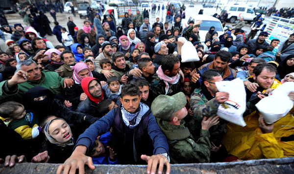 Kaçmayı başaranların hali de perişan. Uluslararası haber ajansları, bölgeden sivillerin yiyecek yardımı almak için birbirini ezdiği fotoğraflar geçiyor. Fotoğraflarda dikkat çeken ayrıntı ise, dağıtılan yardım poşetlerinin üzerinde Rusya ile Suriye bayrağının birlikte yer alması ve Rusça yazılar olması.