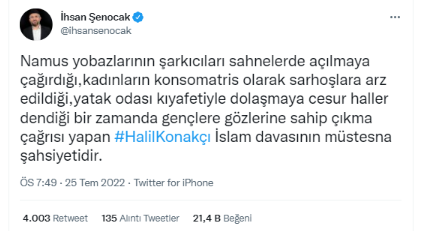 Fıkıh Doktoru Şenocak, Halil Konakcı Hoca'ya Twitter hesabından paylaştığı mesajla destek verdi. Dr. Şenocak, "Namus yobazı şarkıcıların sahnelerde kadınları açılmaya çağırdığı, kadınların konsomatris olarak sarhoşlara arz edildiği, yatak odası kıyafetiyle dolaşmaya cesur haller dendiği bir zamanda gençlere gözlerine sahip çıkma çağrısı yapan Halil Konakcı İslam davasının müstesna şahsiyetidir." dedi.