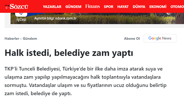 Halkın zam talebi sonrası Tunceli Belediyesi'nin yaptığını ve bu girişimin Türkiye genelinde bir ilk olduğunu duyuran Sözcü gazetesinin, sürekli yaptığı açlık edebiyatının ardından böyle bir haberi köpürterek vermesi ikiyüzlülük olarak yorumlandı.