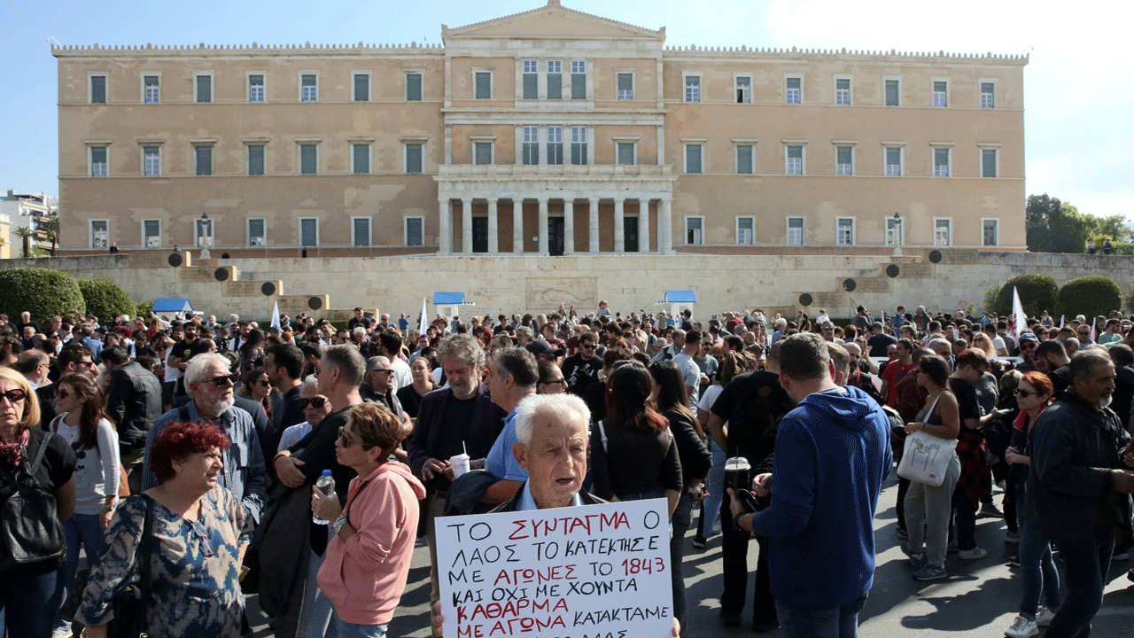 Sintagma Meydanı'ndaki parlamento binasına yürüyen eylemciler, hükümetin çalışma saatlerine getirmeyi planladığı, yılda 37 gün 13 saatlik fazla çalışmaya olanak verecek yasal düzenlemeyi protesto etti.