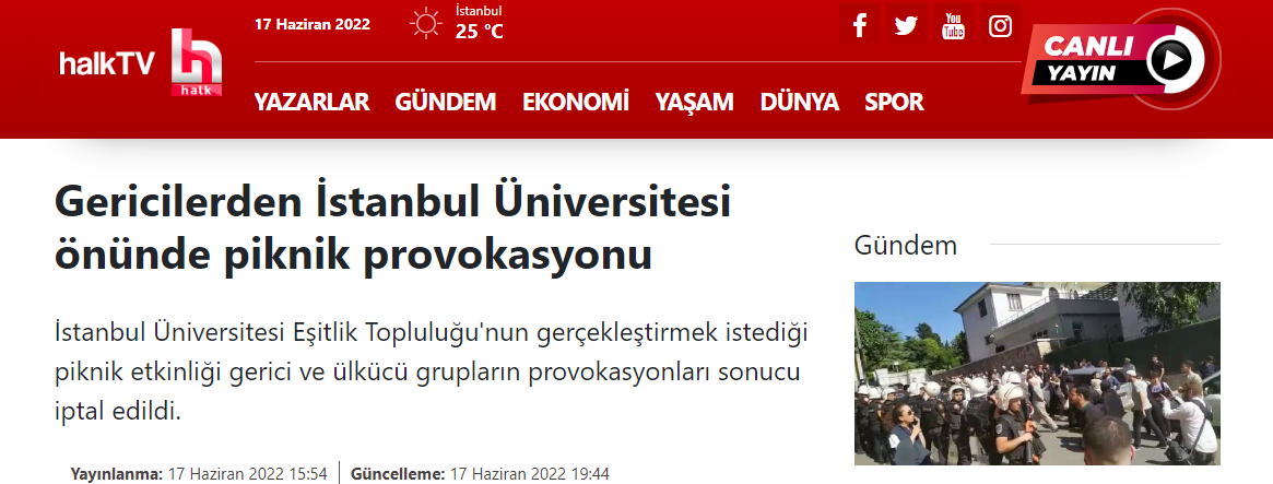 "Gericilerden İstanbul Üniversitesi önünde piknik provokasyonu" diyen Halk TV, "İstanbul Üniversitesi Eşitlik Topluluğu'nun gerçekleştirmek istediği piknik etkinliği gerici ve ülkücü grupların provokasyonları sonucu iptal edildi." ifadelerini kullandı.